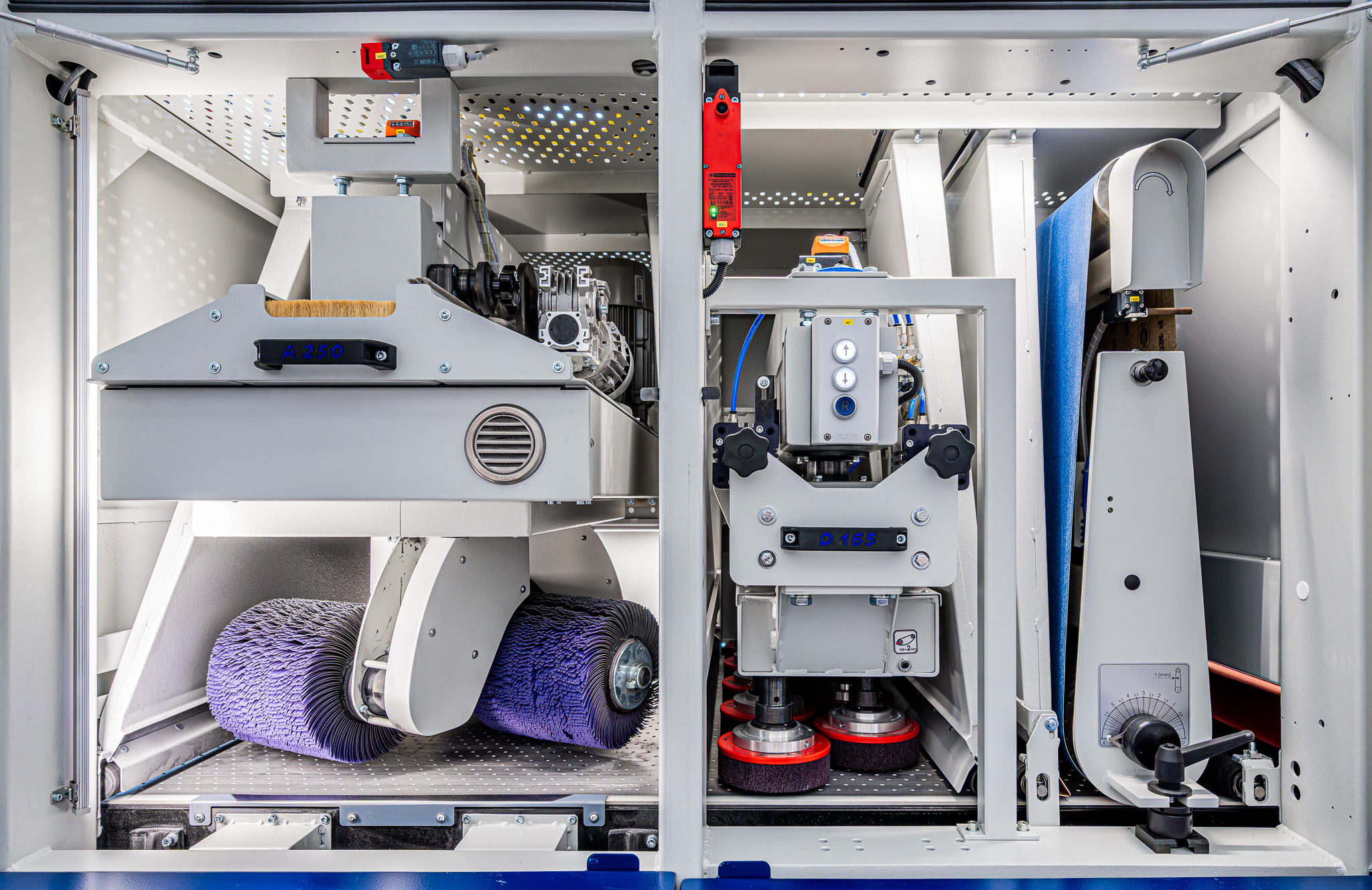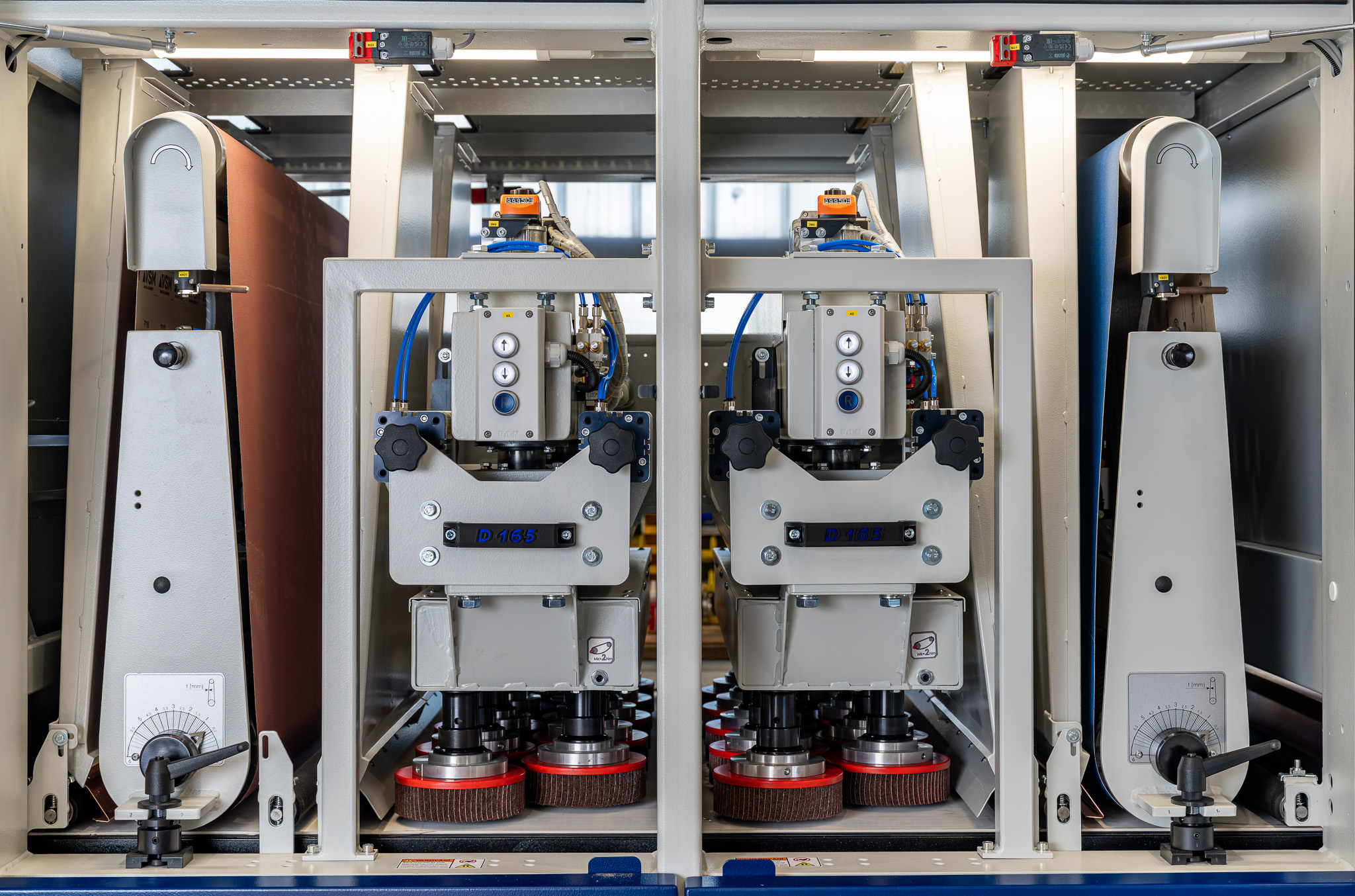 Planetarisk skivebørstenhet (D) – avrunder kantene, skaper radius og fjerner oksydlag på sidene etter laserskjæring.